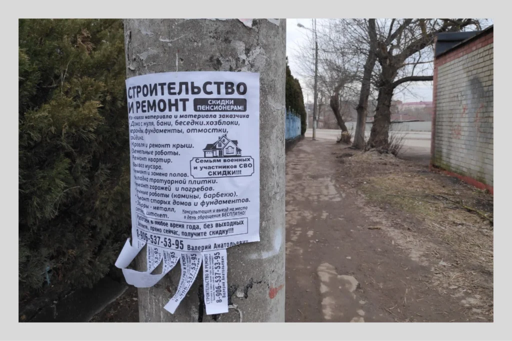 Ещё город живёт подсобными хозяйствами и мелким бизнесом: это магазины электроники, шиномонтажные мастерские, строительные работы. Почти на каждом столбе или заборе — объявления частников: «Продам картофель», «Парикмахерские услуги», «Развал-схождение». На одном из объявлений приписка: «Участникам СВО и ветеранам — скидки».