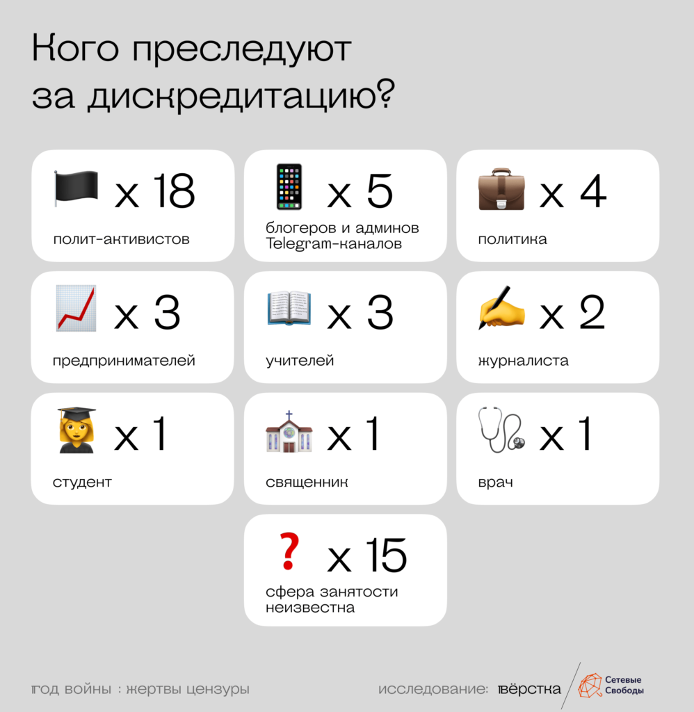 Приговоры по статье о дискредитации армии вынесли, по данным «Сетевых свобод», семи преследуемым: от штрафа в 100 000 рублей до реального срока в три года лишения свободы.