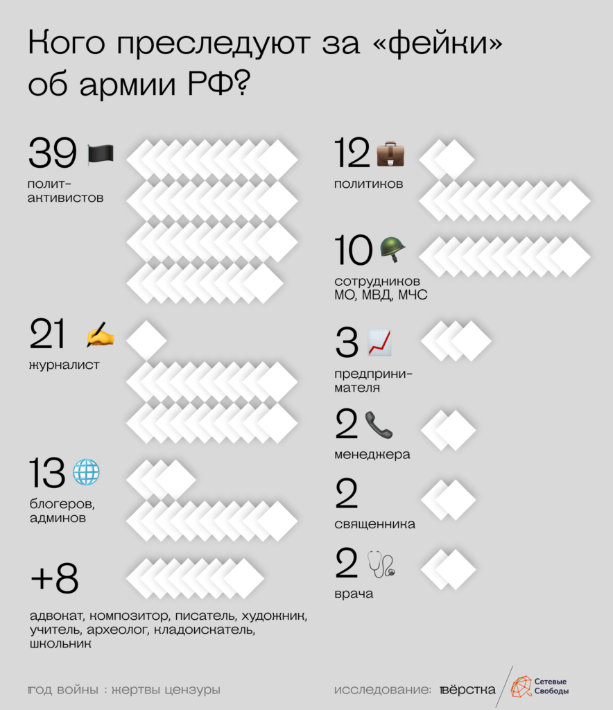К февралю 2023 года в России и на территории Крыма фигурантами дел по новым статьям, по информации «Сетевых свобод», стали не менее 196 человек. Большая часть из них — политактивисты, журналисты и блогеры.