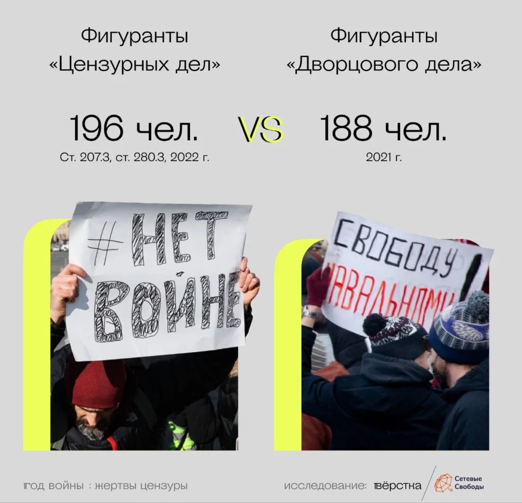 Такое количество преследуемых лишь по двум цензурным статьям превысило масштаб политических репрессий предыдущих лет. Для сравнения, фигурантами «Дворцового дела» в 2021 году — последнего самого массового преследования противников режима — стали 188 человек, следует из подсчётов «ОВД-Инфо».