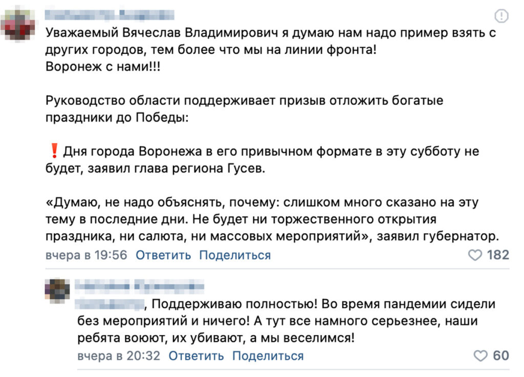 «В тот самый момент, когда рядом с Белгородом проходят боевые действия, гибнут наши Российские парни, страдают жители области от обстрелов, в Ваших силах отменить фестивали, катки, фейерверки и прочие праздники, которые проводятся за счёт бюджета! Давайте вместо праздников инвестируем эти деньги в наши вооружённые силы, поможем беженцам и вынужденным переселенцам. Это наши люди и сейчас самое время не устраивать праздники, а помогать!» — говорится в петиции (орфография и пунктуация автора сохранены).