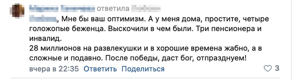 Предприниматель добавил, что недавно он был на границе, в пункте Логачевка, и видел там людей, которые прибывали со стороны Харьковской области. «Их много, им нужна помощь, — говорит Костюк. — Это в первую очередь наши люди — русские! Люди прибывают, их надо одеть, обуть, накормить, предоставить условия. Поэтому на текущий момент считаю абсолютно неуместными траты на праздники, катки, фестивали». Костюк уверен: если его петиция так быстро собрала тысячи откликов, значит, многие с ним согласны.