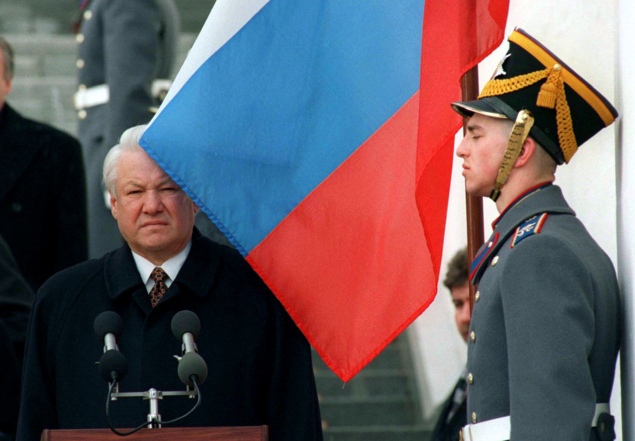 Фото: Первый президент РФ Борис Ельцин на фоне российского флага в 1996 году. Reuters