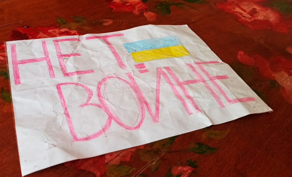 Регина показывает листок бумаги, на котором розовым карандашом написано: «Нет войне». Это — уцелевший плакат, который она не успела повесить. Два других —они выполнены в той же манере — изъяла полиция, когда пришла по обращению соседки.