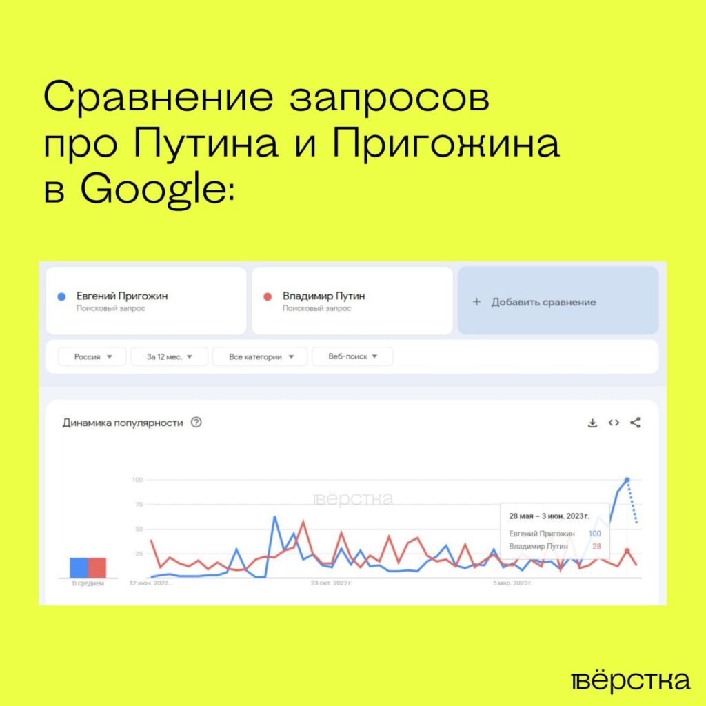 Согласно Google Trends, рост интереса к Пригожину начался в первых числах мая и достиг рекордных значений за всё время к концу месяца. Если с 28 мая по 3 июня динамика популярности владельца ЧВК была на уровне 100 баллов (наивысший показатель), то интерес к президенту в это же время был более чем в три раза ниже — он достигал лишь 28 баллов.