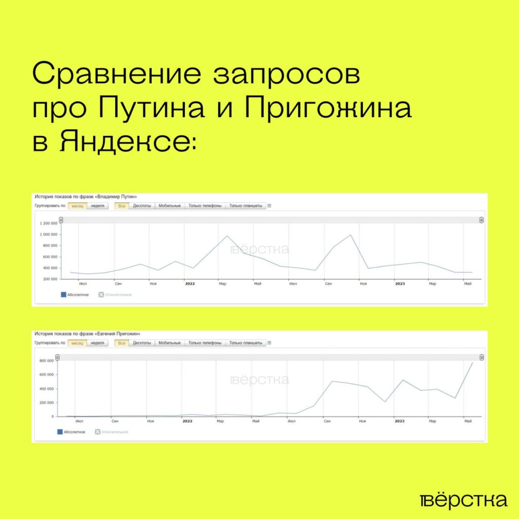 Тенденцию роста популярности Пригожина подтверждает и Yandex Wordstat. По данным сервиса, в мае через поисковик «Яндекса» информацию о «поваре Путина» запрашивали 744 тысячи раз (это также рекордные значения — предыдущий пик запросов о Пригожине пришелся на январь, тогда информацию о нём искали почти 498 тысяч раз). В то же время число показов по запросу «Владимир Путин» за май достигло лишь 305 тысяч — это в 2,4 раза меньше, чем у запроса «Евгений Пригожин».