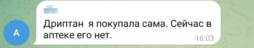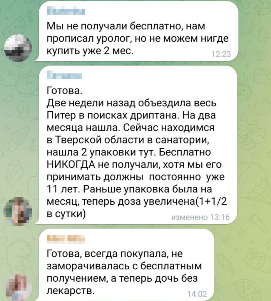 Ольга Чолак к аналогам настроена менее оптимистично. Она успела перекупить две пачки «Дриптана» у одной из знакомых мам (до прекращения продаж упаковка «Дриптана» в электронной аптеке стоила чуть больше тысячи рублей за 30 таблеток. — Прим. «Вёрстки».). Когда препарат закончится, Ольга надеется получить его из-за границы — её бабушка живет в Турции. «Иначе я не знаю, что нам делать. Аналоги не всем подходят. Некоторые девочки (из сообщества родителей детей со Spina bifida. — Прим. ред.) жаловались, что от аналогов нет вообще никакого эффекта, а у других появляются побочки: высыпания, жар, мочеполовые инфекции», — говорит Ольга.