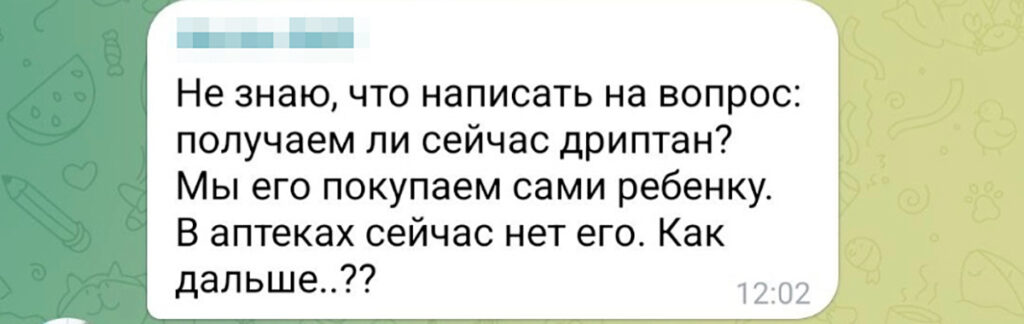 Но, связавшись с представителями фармацевтической компании Abbott, сотрудники фонда выяснили, что продажа «Дриптана» в России прекращена: «Это не логистика, не застрявшие машины на границе, это полное отсутствие препарата», — рассказывает Елена Морякина. При этом 14 марта 2022 года на сайте Abbott опубликовано официальное заявление, согласно которому компания останавливает «второстепенную деятельность» в России, включая инвестиции и рекламу, но не останавливает поставки жизненно важных лекарств.