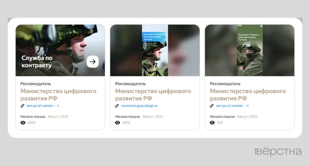 Минцифры совместно с другими органами власти только в рекламной сети «Яндекса» достигли более 200 миллионов показов баннеров с рекламой контрактной службы. «Вёрстка» нашла признаки размещения рекламы и в рекламной сети myTargeti, но не смогла оценить её объёмы.