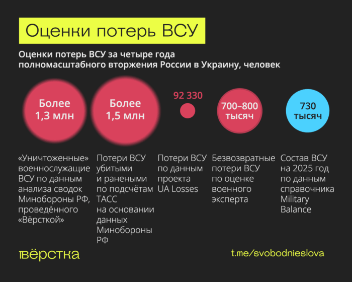 «Вёрстка» проанализировала сводки Министерства обороны за четыре года войны — самыми впечатляющими оказались данные о количестве потерь ВСУ. Так, за четыре года армия России «уничтожила» больше 1,3 млн человек. При этом, по данным справочника Military Balance, во всех вооружённых силах Украины на 2025 год было 730 тысяч военнослужащихi.
