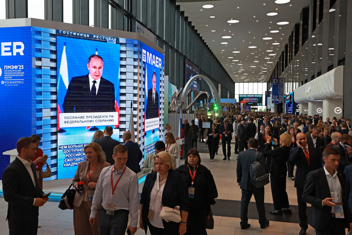 Фото: Участники Санкт-Петербургского международного форума на фоне экрана с Владимиром Путиным. 19 июня 2025 года. REUTERS/Anton Vaganov