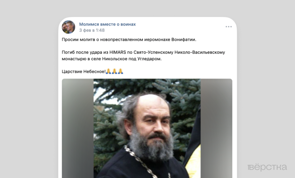 2 января группа молилась за упокой Романа, который «был добрым и отзывчивым, в детстве никогда не проходил мимо бездомных животных и помогал пенсионерам». 3 января — за упокой добровольца Андрея, отца троих детей. 6 января — о воине Сергии, который был «прекрасным сыном, отцом, братом, всегда и везде примером». 14 января — за воина Димитрия, который «погиб на поле брани за други своя». 19 января — о воине Александре, чьё тело пока не могут эвакуировать. 25 января — об иеромонахе Дамаскине, который на передовой «окормлял бойцов». 3 февраля — о «новопреставленном иеромонахе» Вонифатии, который «погиб после удара из HIMARS по Свято-Успенскому Николо-Васильевскому монастырю в селе Никольское под Угледаром».
