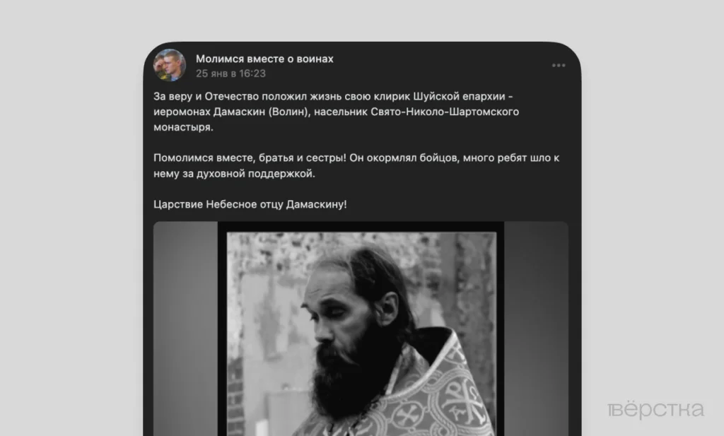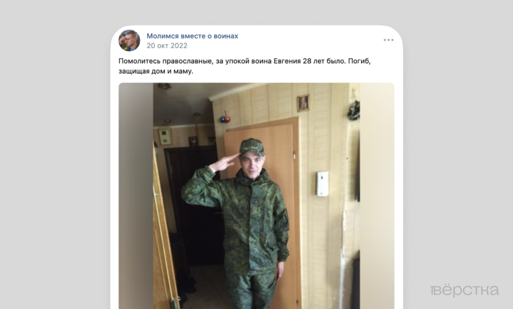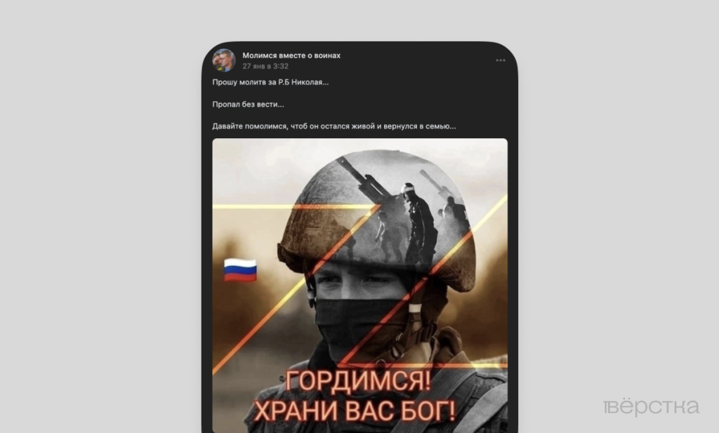 Когда семьям сообщают о гибели военнослужащих, на стене группы появляются фотографии в том числе с черными лентами — на них мужчины в военной форме и часто с оружием или в рясе.