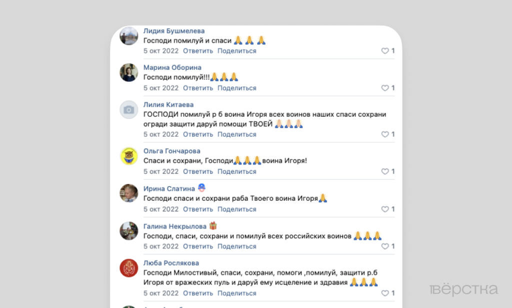 «Твоя любовь и вера в Бога придадут много силы душевной, духовной и телесной твоему любимому!!! Молитвы будут охранять от погибели! Господи Иисусе Христе Сыне Божий, спаси, сохрани и защити воина Игоря от пуль, пленения и погибели!», — ответила Елене другая подписчица, из Рязанской области.
