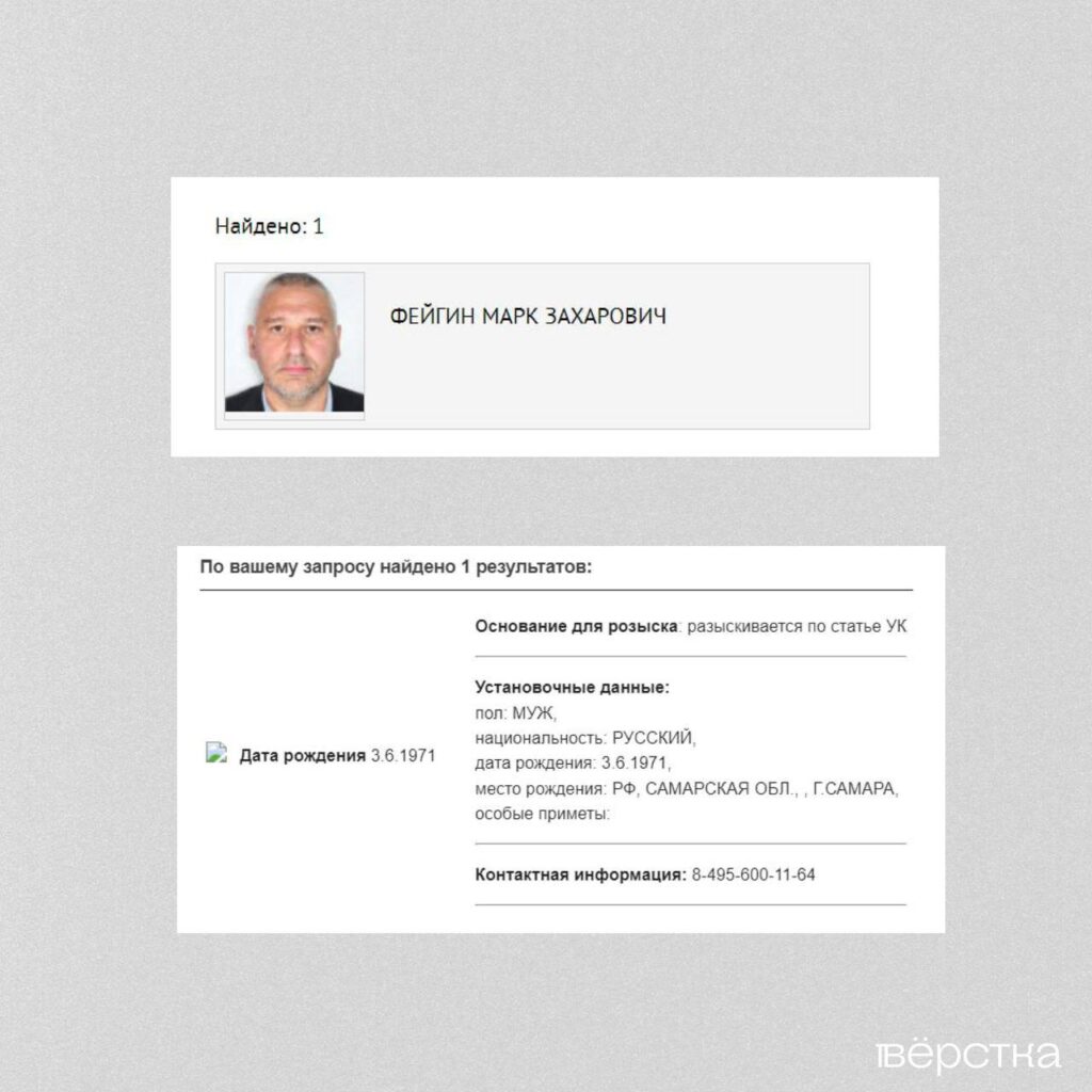 В карточке розыска говорится, что Фейгин «разыскивается по статье УК», однако, как обычно, по какой именно — не уточняется.