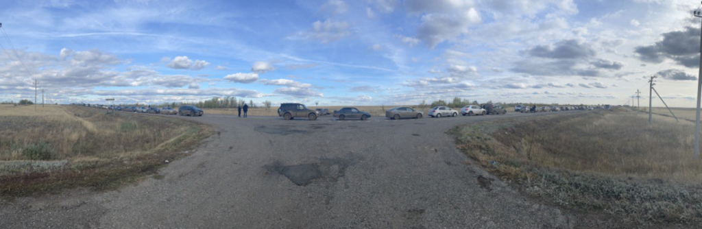 Очереди на пропускных пунктах России с соседними странами растянулись на десятки километров (27 сентября длина очереди перед пунктом Верхний Ларс составляла от 20 до 30 км). Люди стоят в них сутками. Те, у кого нет автомобилей, вынуждены спать на земле или на полу в здании КПП. У многих заканчивается вода и бензин. Параллельно российские СМИ сообщают, что на границах с Грузией и Финляндией открыли мобилизационные пункты, и от этого у части людей появляются панические настроения.