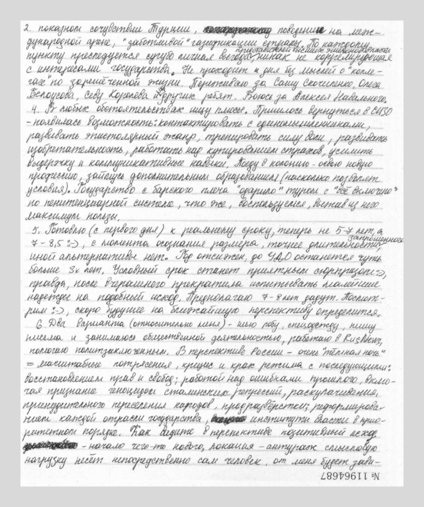 Относительно себя я вижу несколько вариантов будущего: шью робу, спецодежду, пишу письма и занимаюсь общественной деятельностью, работаю в RusNews, помогаю политзаключенным. В перспективе России — очень «темная ночь» = масштабные потрясения, кризис и крах режима с последующими: восстановлениями прав и свобод; работой над ошибками прошлого, включая признание геноцидом сталинских репрессий, раскулачивания, принудительного переселения народов, продразвёрстки; реформирование каждой отрасли государства, институтов власти в приоритетном порядке. Как видите, в перспективе позитивный исход — начало чего-то нового, локация — антураж, смысловую нагрузку несет непосредственно сам человек. От меня будет зависеть уровень адаптации в колонии и объем позитивного опыта, приобретенного под стражей (негативный здесь же оставлю, зачем он на свободе).