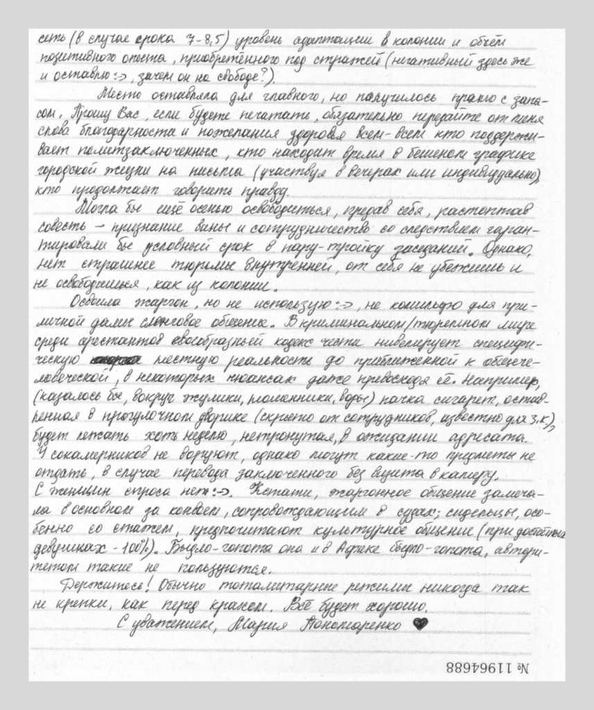 Прошу вас, если будете печатать, обязательно передайте от меня слова благодарности и пожелания здоровья всем-всем, кто поддерживает политзаключенных, кто находит время в бешеном графике городской жизни на письма (участвуя в вечерах или индивидуально), кто продолжает говорить правду.