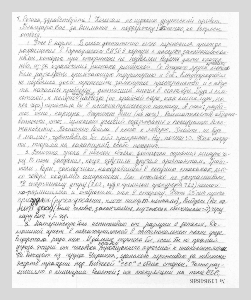 Перед оглашением вердикта суда «Вёрстка» попросила Марию Пономаренко рассказать о своём состоянии, ожиданиях от приговора и видении будущего. Публикуем её ответ, присланный из СИЗО.