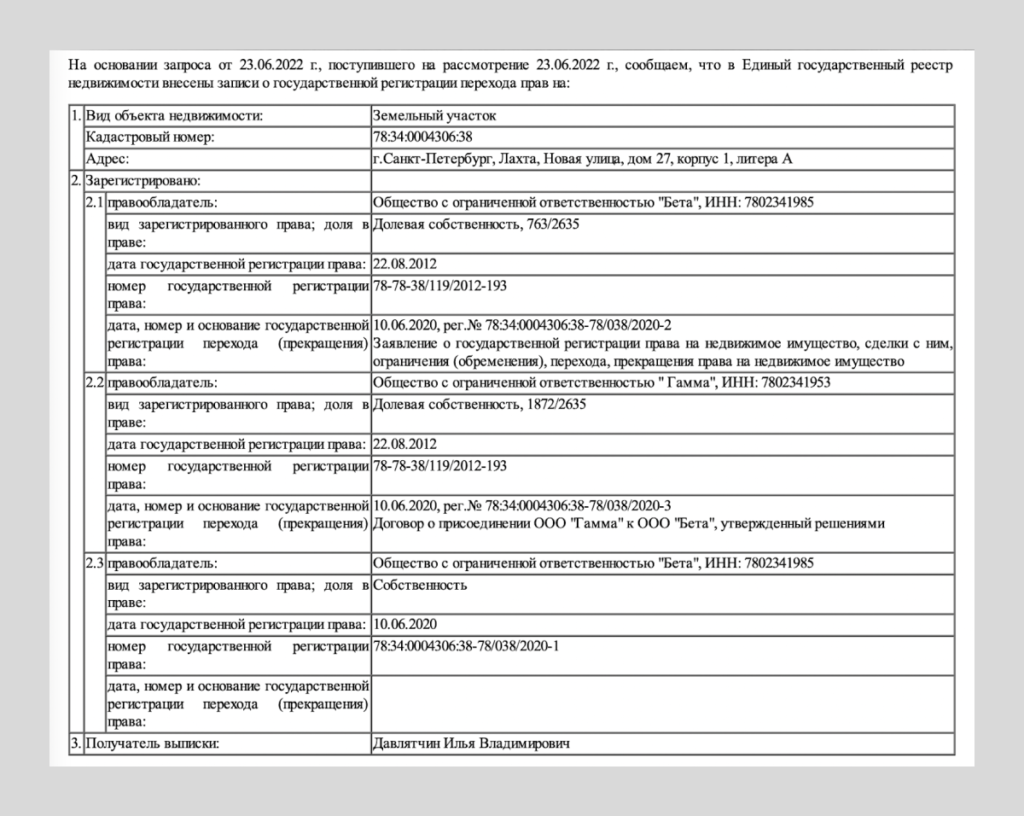 Самым крупным лендлордом является единственный сын Пригожиных — Павел. Лично на него записан особняк в 937 кв. м, расположенный на участке в 25 соток. Он может стоить в районе 90–95 млн рублей. Также в коттеджном посёлке «Северный Версаль» есть трёхэтажный дом в 2,6 тысячи кв. м (он стоит на участке в 26 соток). Это многофункциональный комплекс «Лахтинский пассаж». Внутри находятся 18 апартаментов свободных планировок, а на первом этаже — SPA-центр с бассейном. Формальным владельцем земли является ООО «Бета», следует из выписки ЕГРН, которая имеется в распоряжении «Вёрстки». Эту фирму в 2005 году создал Евгений Пригожин, но сейчас её единственным учредителем является Павел. «Бета» занимается правовой деятельностью, на конец 2021 года в ней работали всего три человека, говорится в данных системы СПАРК. Несмотря на это, прибыль компании в 2021 году составила почти 37 млн рублей. На Новой улице продаётся дом в четыре с лишним раза меньше, но стоящий на таком же по площади участке. Его начальная стоимость составляет 63,5 млн рублей. Значит, минимальная цена «Лахтинского пассажа» может достигать 260 млн рублей (и это без учёта торгов).