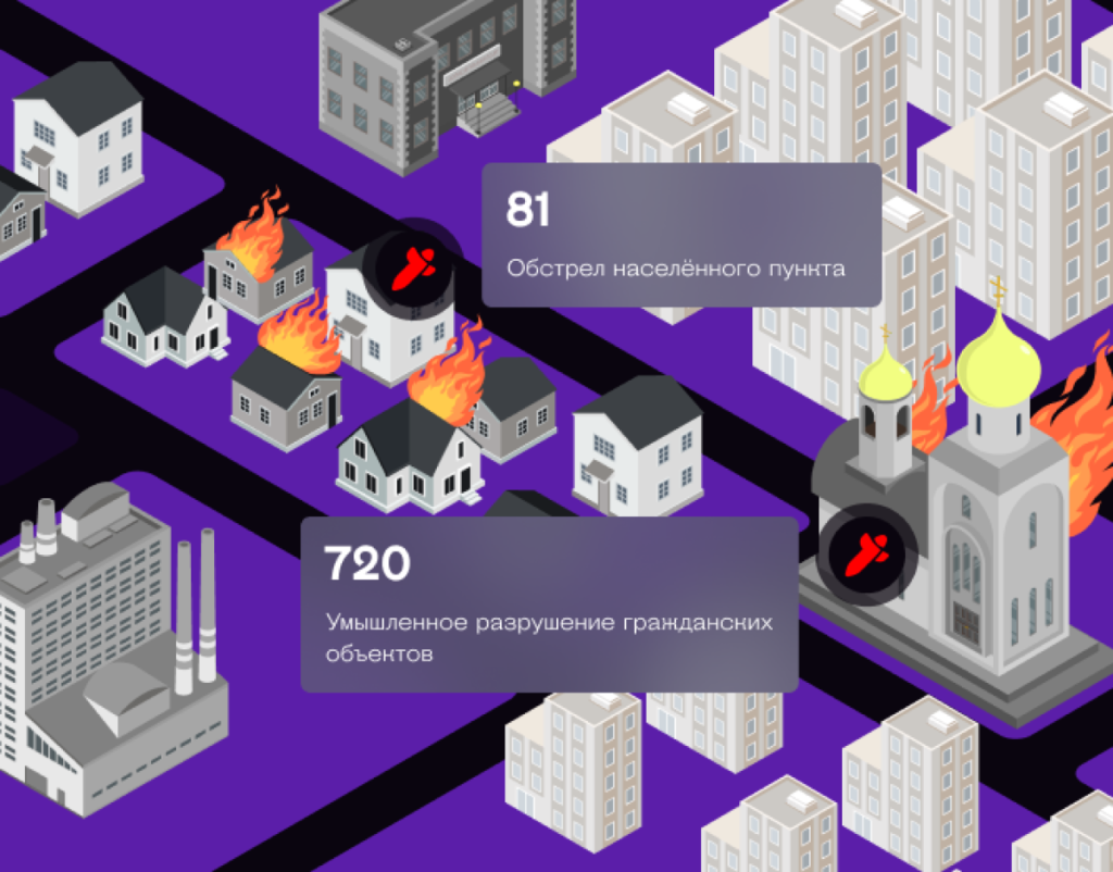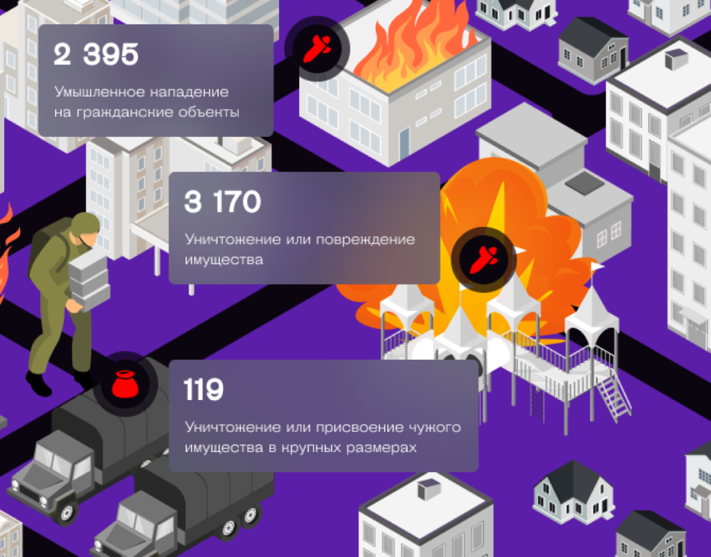 На сегодня больше всего свидетельств собрано об уничтожении или повреждении имущества украинских граждан — 3170 сообщений. Второе по частоте упоминаний — нападение на гражданские объекты. Движение задокументировало 2395 таких случаев.