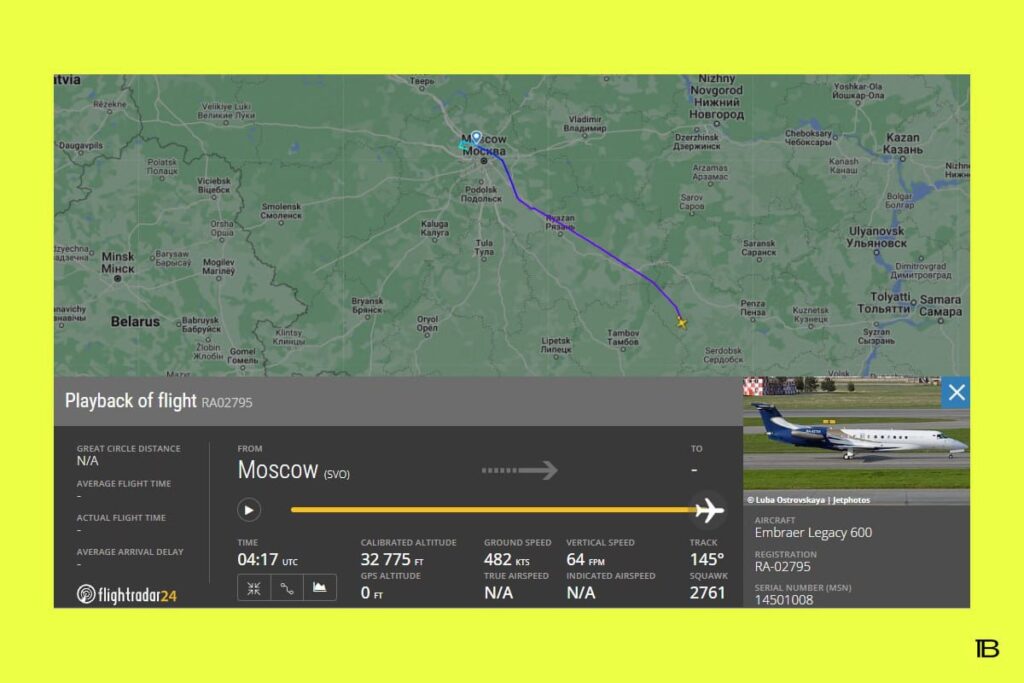 Согласно данным Flightradar, самолёт главы ЧВК вылетел из московского аэропорта Шереметьево в 6:37 (мск) и направился на юг. Сигнал борта пропал над посёлком Башмаково в Пензенской области. Спустя чуть больше часа сигнал вновь появился на 10 минут над Кумылженским районом Волгоградской области в сервисе Flightaware. В это время, судя по траектории полёта, бизнес-джет поворачивал в сторону города Миллерово в Ростовской области, где расположен военный аэродром — ближайший к прифронтовым территориям.