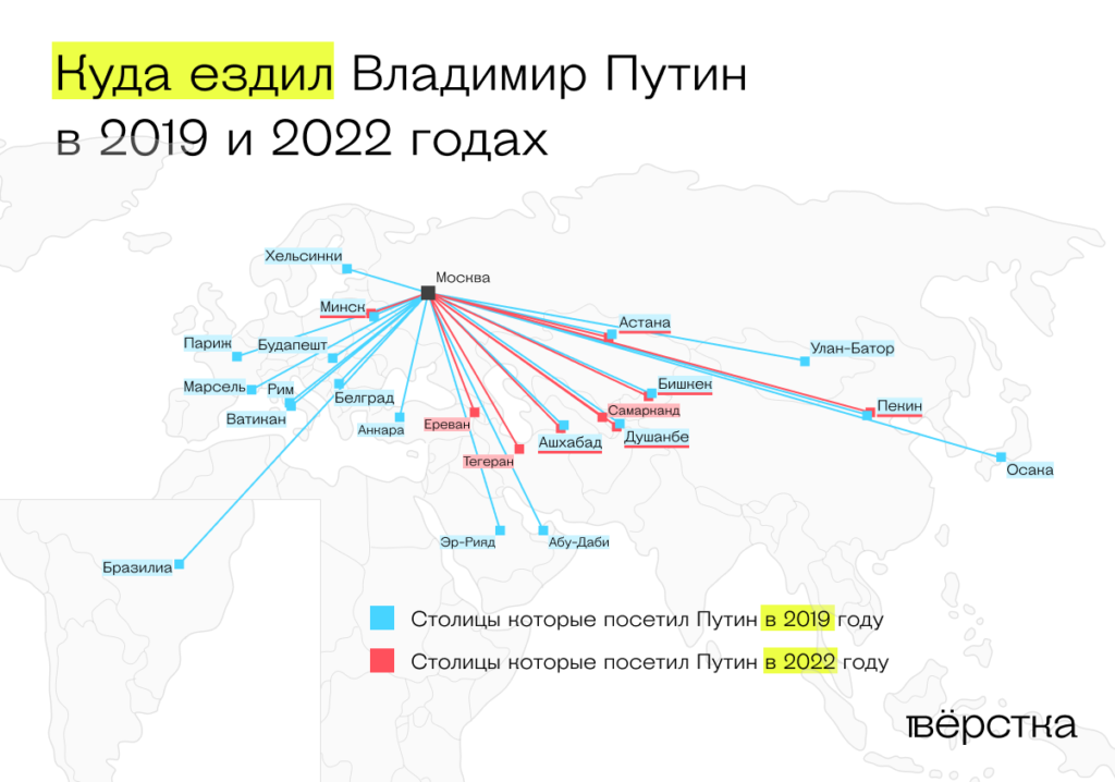 По сравнению с 2019–м количество поездок Путина как за рубеж, так и внутри страны сократилось почти втрое. В 2022–м он выезжал лишь 24 раза, и всего девять — за пределы страны. В 2019–м таких поездок было 62, из которых 22 — за пределы РФ, почти в половине случаев — в страны Европы.