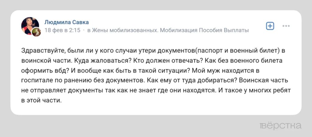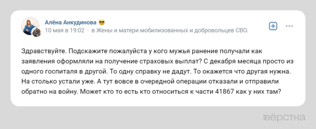 Трудности с получением справок и долгое ожидание выплат активно обсуждаются в тематических пабликах и чатах. Жёны мобилизованных и контрактников пишут, что госпитали зачастую медлят с выдачей справок или вовсе отказываются их выписывать, а чиновники из Минобороны и комиссары в военкоматах «теряют» документы и путают данные.