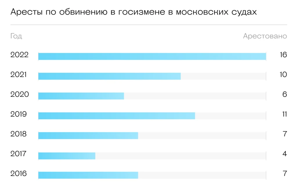 Число арестованных в Москве по делам о госизмене поступательно росло как минимум с 2016 года. Тогда, согласно порталу Мосгорсуда, под стражу взяли троих обвиняемых по ст. 275 УК (при этом в картотеке не отражены, в частности, арестованные в тот период четверо фигурантов дела Центра информационной безопасности ФСБ — то есть в действительности «госизменников» могло быть больше). Спустя год, по официальным данным, в столице арестовали четверых, в 2018‑м — семерых, в 2019 году — 11 фигурантов подобных дел. Некоторый спад был в ковидный период — но в год начала «специальной военной операции» количество зафиксированных арестов в Москве достигло исторического максимума в 16 человек.
