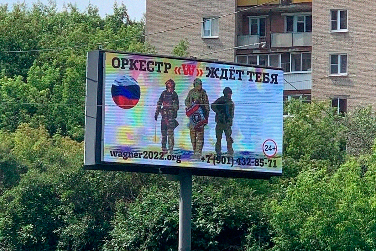 ЧВК Вагнера стала активно искать новобранцев ещё в начале боевых действий в Украине. В первые месяцы объявления публиковались в соцсетях и закрытых чатах. Теперь призывы вступать в ряды наёмников появляются и на городских билбордах.
