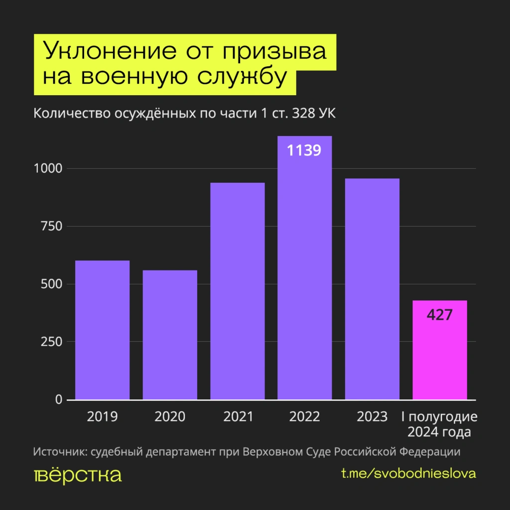В первом полугодии 2024 года 427 россиян осудили за уклонение от призыва на военную службу (часть 1 статьи 328 УК), подсчитала «Вёрстка» на основе данных судебного департамента при Верховном суде. Одного человека судили за уклонение от прохождения альтернативной гражданской службы (часть 2 статьи 328 УК).