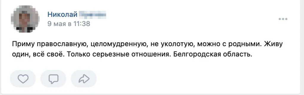 A 31-year-old man from Taganrog, addressing himself as Vikentiy, wrote in a group called «Helping Refugees in Saint Petersburg» that he was ready to help «a slim girl.» He told us that he lived in a studio but was planning to buy a bigger home for himself and his future spouse, and was looking for a Ukrainian partner.