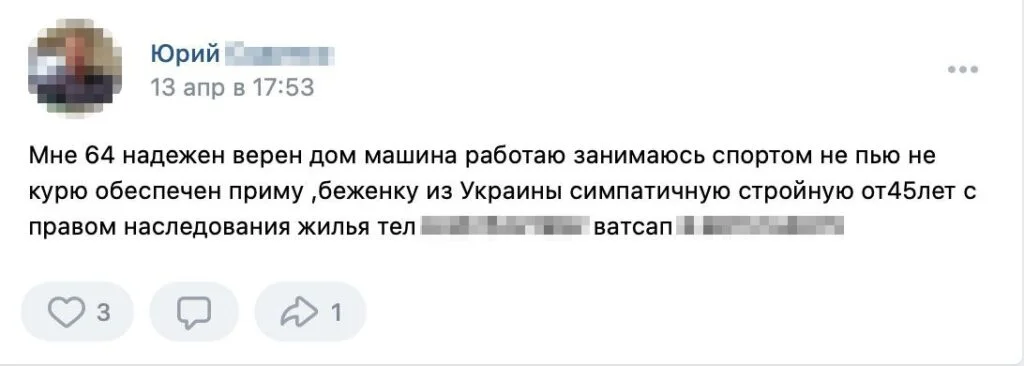 The posts showed up in both regional groups, such as «Settlers and Refugees in Kaluga» and «Helping Refugees in Saint Petersburg,» and in national online communities. In one popular group, called «Ukrainian Refugees,» which boasts nearly a thousand members, the first ads appeared in late February. In May, twenty-two men had authored posts offering to help Ukrainian women.