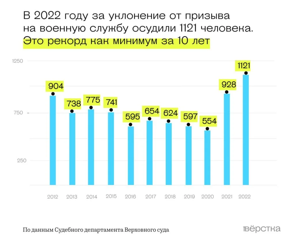 В прошлом году по статье об уклонении от призыва на военную службу (часть 1 статьи 328 УК) осудили 1121 человека, следует из статистики Судебного департамента Верховного суда. Как выяснила «Вёрстка», это рекордный показатель как минимум за 10 лет.