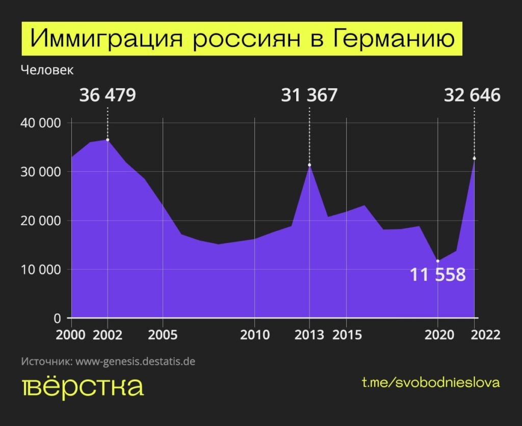 Резкий всплеск иммиграции произошёл в 2013 году — после протестов 2012 года и возвращения Владимира Путина на пост президента. Если в 2012 году из России в Германию переехали 18 812 граждан, то в 2013 уже 31 367 человек. Затем поток переселенцев вновь снижался, к 2021 году он достиг 13 718 человек. Таким образом, в первый год войны иммиграция из России в Германию увеличилась почти в 2,4 раза в сравнении с предыдущим годом.