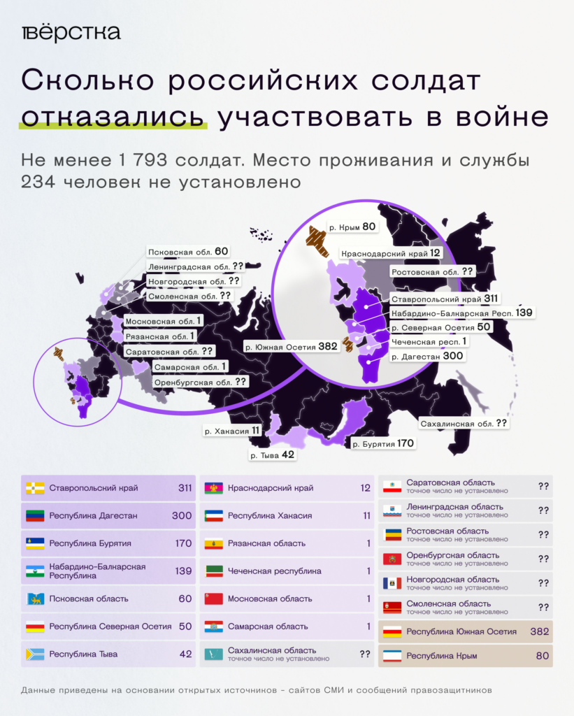 По данным российских правозащитных организаций и СМИ, с начала войны служащие из 22 регионов сообщили о том, что не хотят воевать. «Вёрстка» посчитала все случаи, о которых стало известно с конца февраля: по открытым данным, как минимум 1 793 россиянина заявили, что хотят сложить оружие (подробное описание расчётов — в последнем блоке материала. — Прим. ред.).
