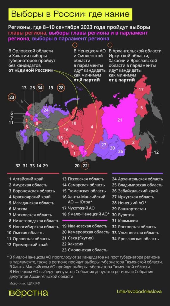 ▫️ Региональные парламенты будут выбирать жители 16 российских регионов и четырёх аннексированных территорий Украины. В двух из них — Иркутской области и Хакасии — на прошлых выборах в 2018‑м году партию власти победила КПРФ