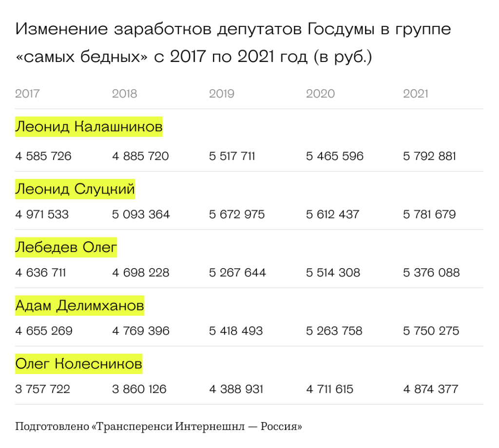 Как видно из этой таблицы, заработки депутатов, официально не имеющих дополнительных источников доходов, за последние четыре года выросли в среднем на 15–30 %. Так, рост доходов Олега Колесникова составил 30 %, Леонида Калашникова — 26 %, Адама Делимханова — 24 %, Олега Лебедева и Леонида Слуцкого — 16 %.