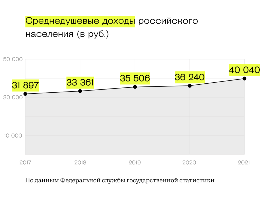 Ещё меньше, по подсчётам Росстата, изменились среднедушевые доходы российского населения: за четыре года они увеличились на 26 %.