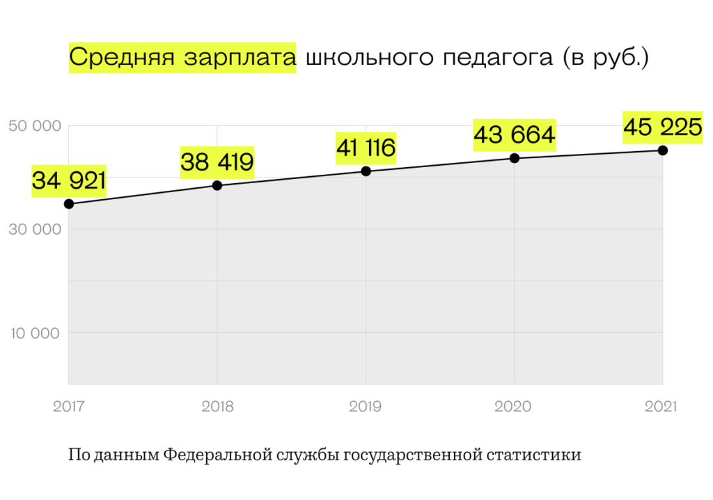 Для сравнения: по данным Росстата, средняя зарплата школьного педагога в 2017 году составляла 34 921 рублей, в 2021 году — 45 225 рублей. То есть за пять лет она выросла примерно на 30 %. Средний учитель получает на порядок меньше, чем самый бедный из чиновников АП, публично отчитывающихся о своих доходах.
