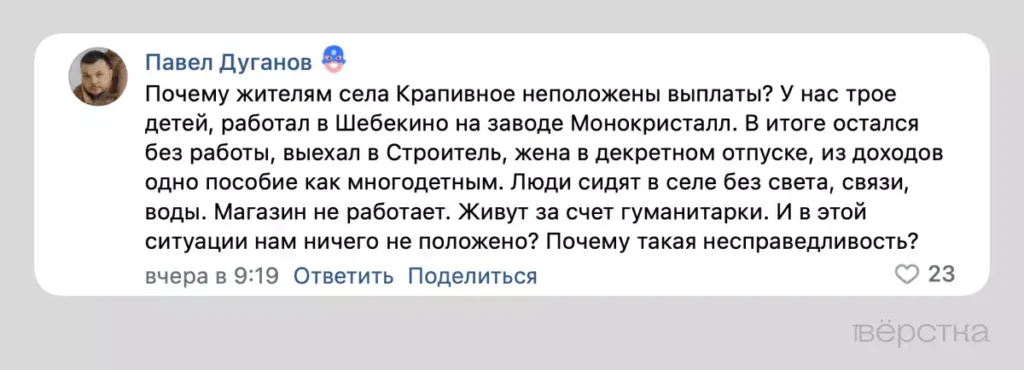 «Почему жителям села Крапивное не положены выплаты? У нас трое детей, работал в Шебекино на заводе „Монокристалл“. В итоге остался без работы, выехал в Строитель, жена в декретном отпуске, из доходов одно пособие как многодетным. Люди сидят в селе без света, связи, воды. Магазин не работает. Живут за счет гуманитарки. И в этой ситуации нам ничего не положено? Почему такая несправедливость?», — написал беженец из Крапивного Павел Дуганов.