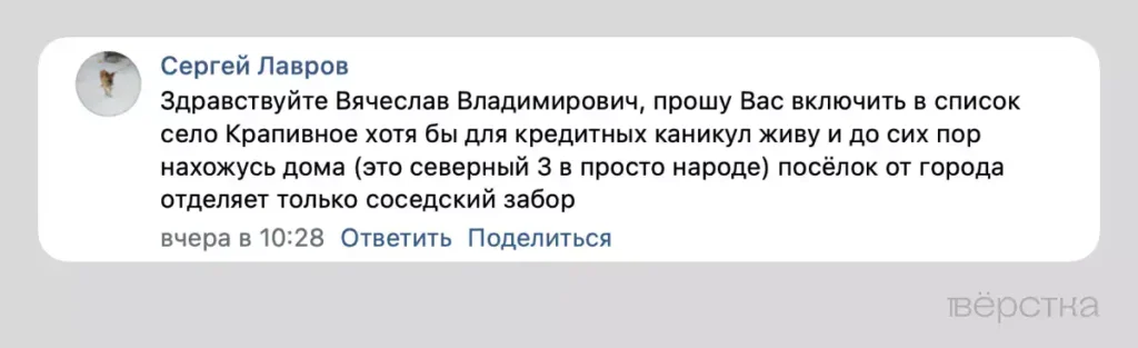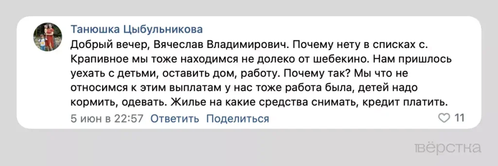 Практически все комментарии под постами губернатора Белгородской области Вячеслава Гладкова во «ВКонтакте» за последнюю неделю посвящены массированным обстрелам Шебекино и окрестностей. После 5 июня значительную часть из них оставляют жители сёл вокруг Шебекинского. В этот день Гладков опубликовал список из 38 сёл, посёлков и хуторов, жители которых могут претендовать на единовременную денежную выплату, кредитные и коммунальные каникулы.